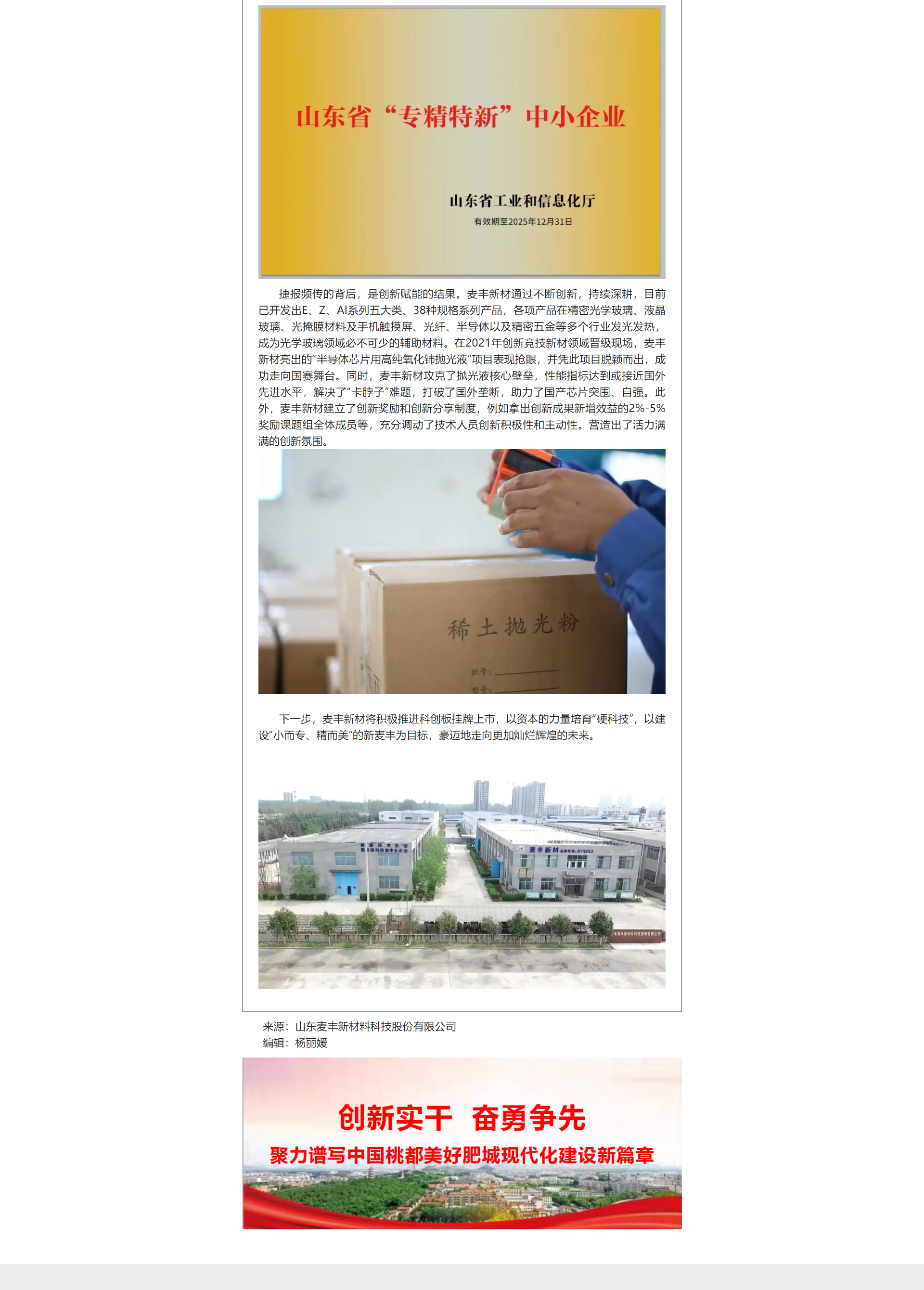 肥城高新公眾號刊發(fā)《山東麥豐新材料科技股份有限公司"瞪羚企業(yè)"培育“硬科技”,建設“小而專、精而美”,激發(fā)高質(zhì)量發(fā)展新動能》文章